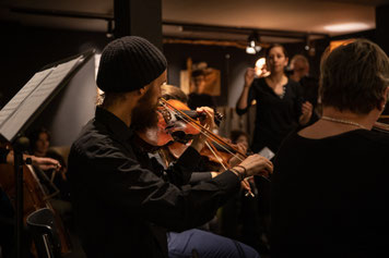 Zehn Streich- und Blasinstrumentalist*innen spielten mit Synthie-Spezialist Olivier Zurkirchen, dirigiert von Anicia Kohler, im Rahmen des dreijährigen Jubiläums der Kaffeebar und Coworking Space Effinger